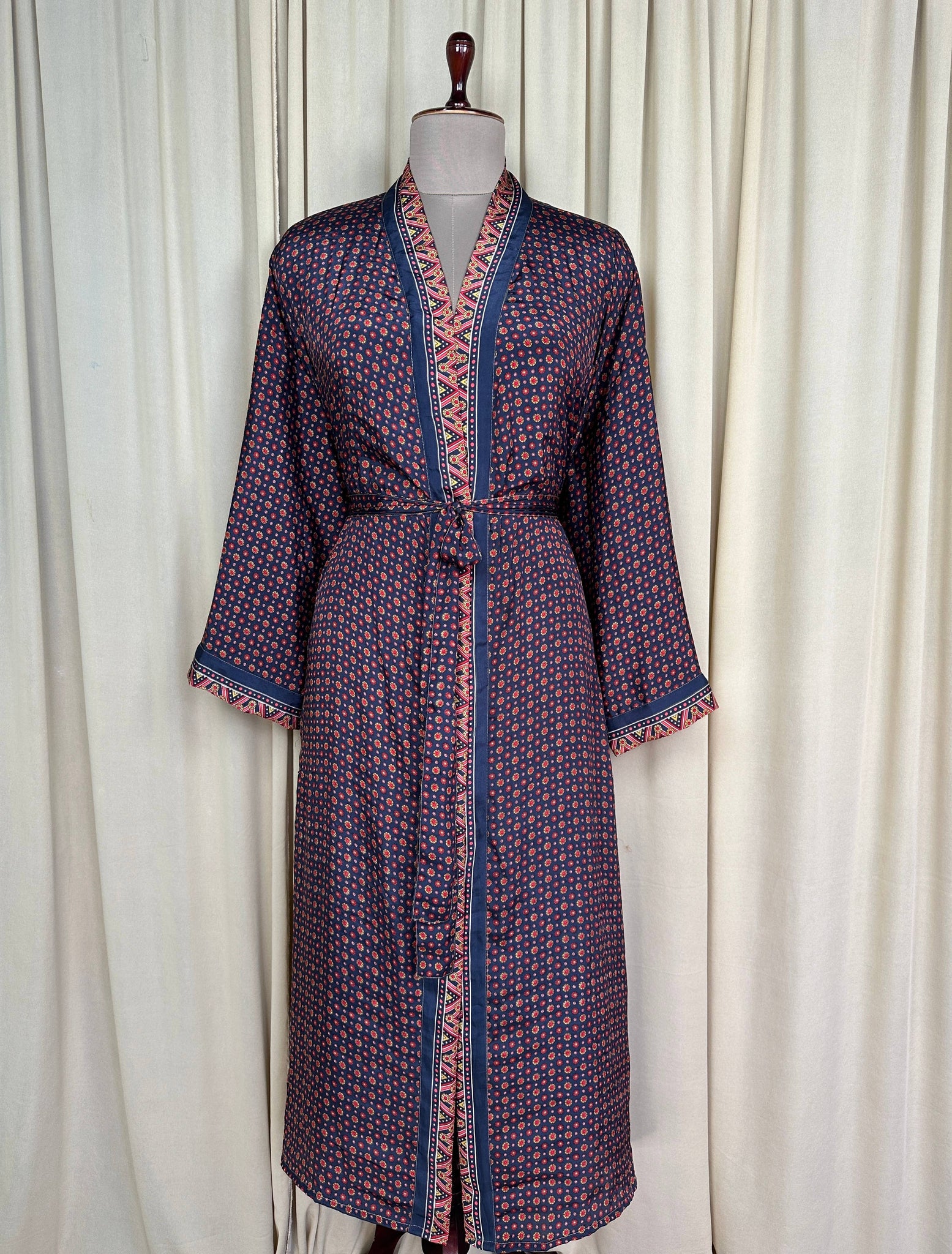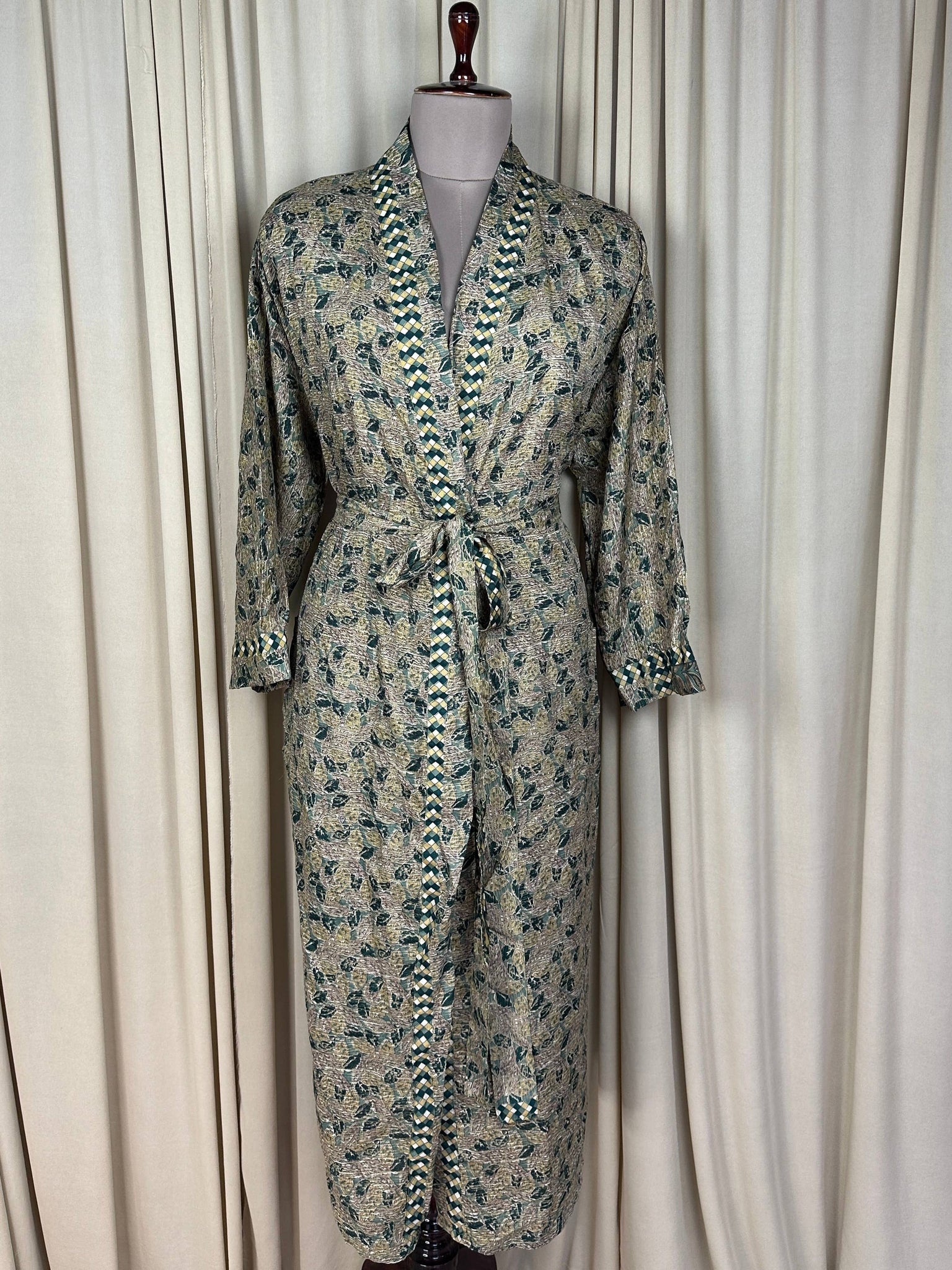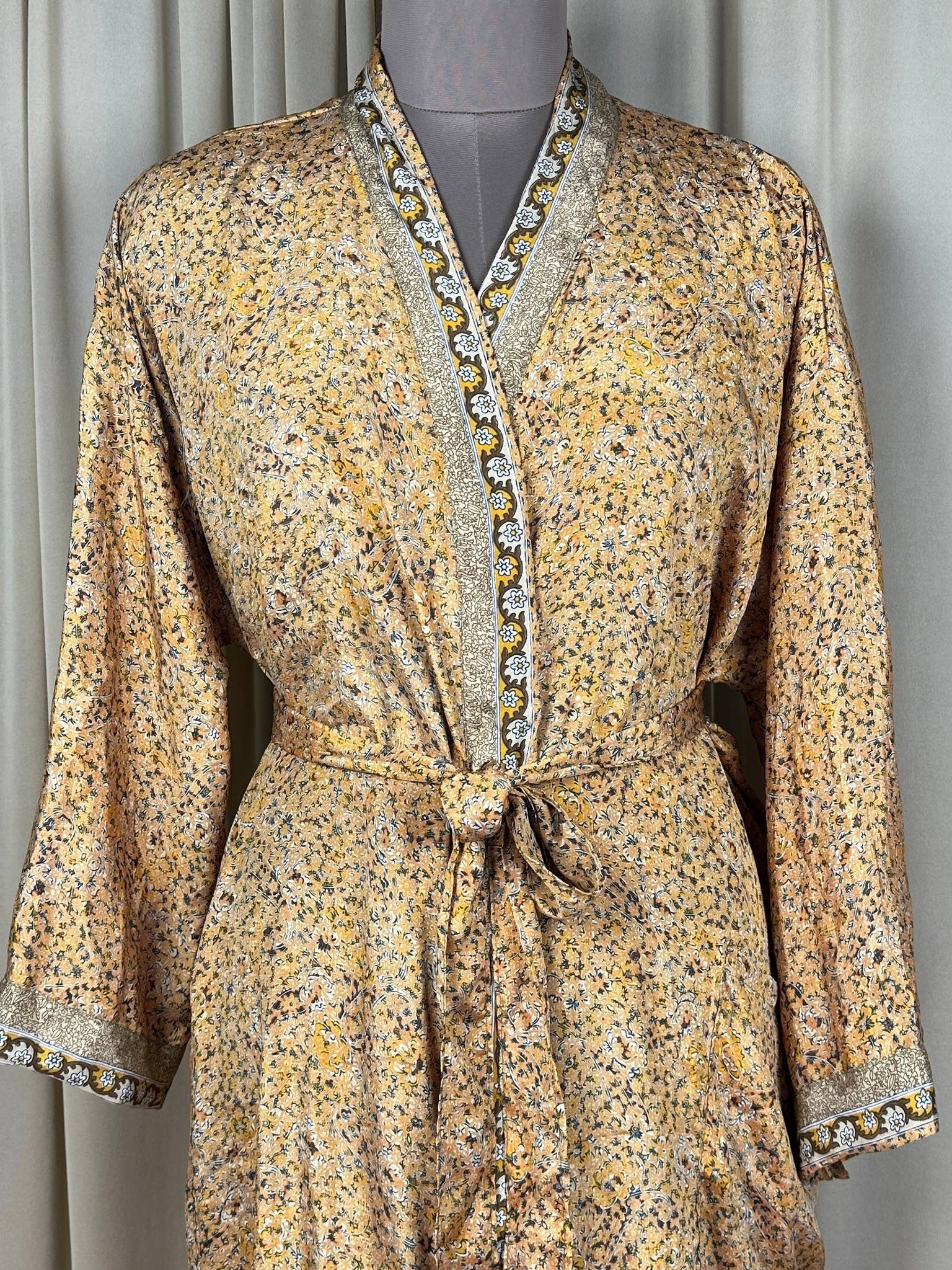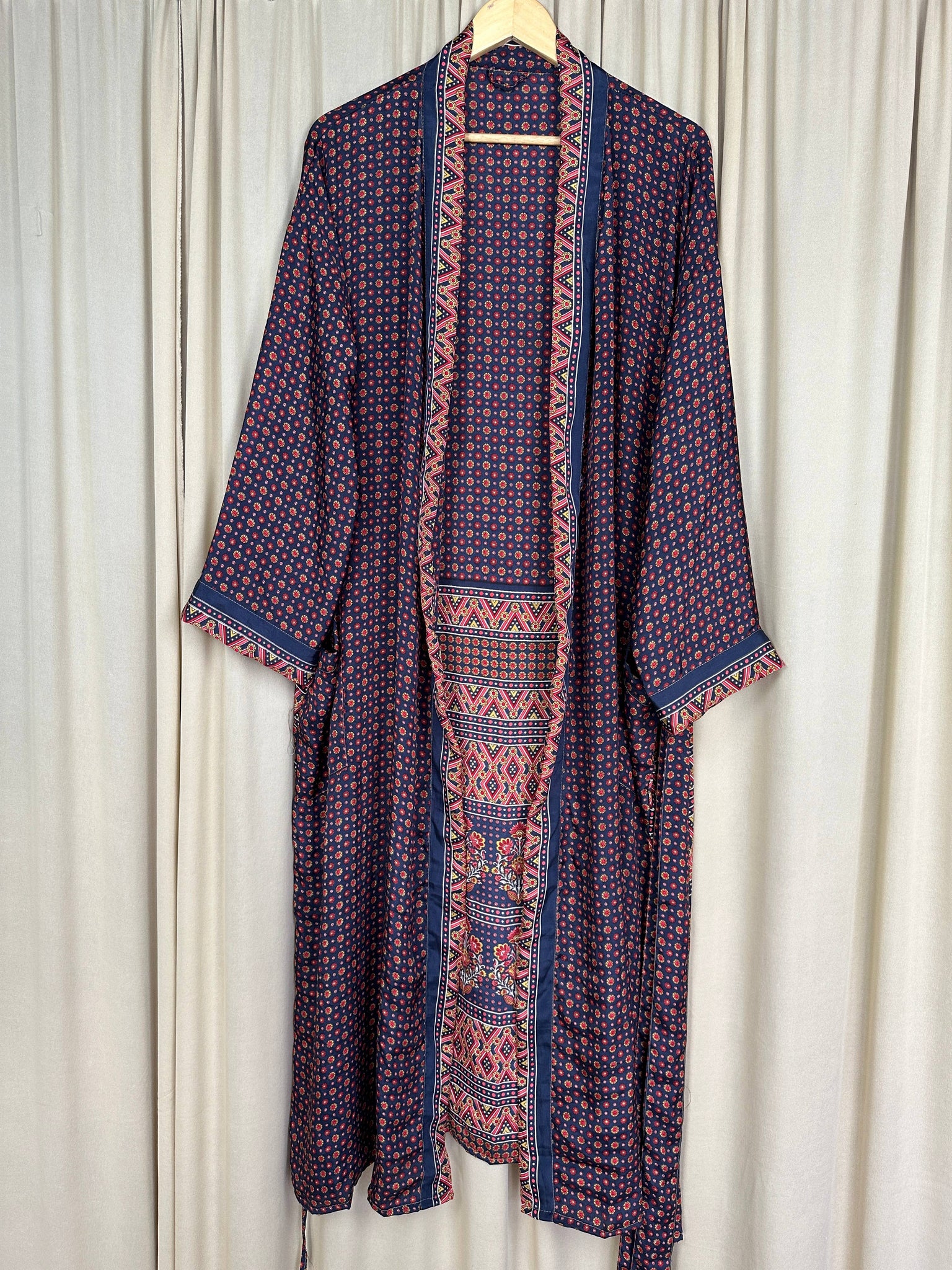 Handcrafted from premium new silk saris, this robe defies convention with its weightless elegance and urban edge. Nearly invisible against your skin, it moves with you—fluid, unapologetic, and undeniably luxurious. Perfect for those who refuse to compromise on comfort or style. Slip into something that feels as good as it looks and let every evening become an act of rebellion against the ordinary.