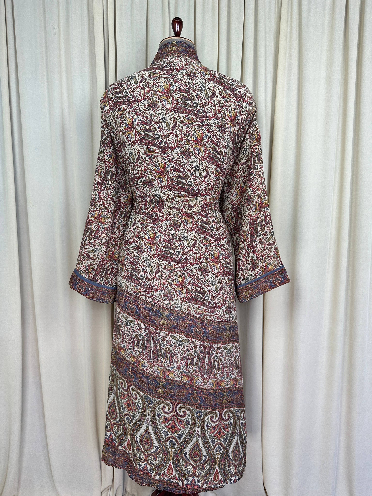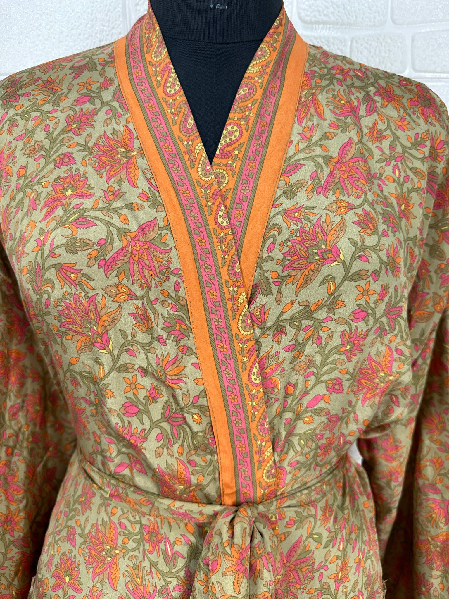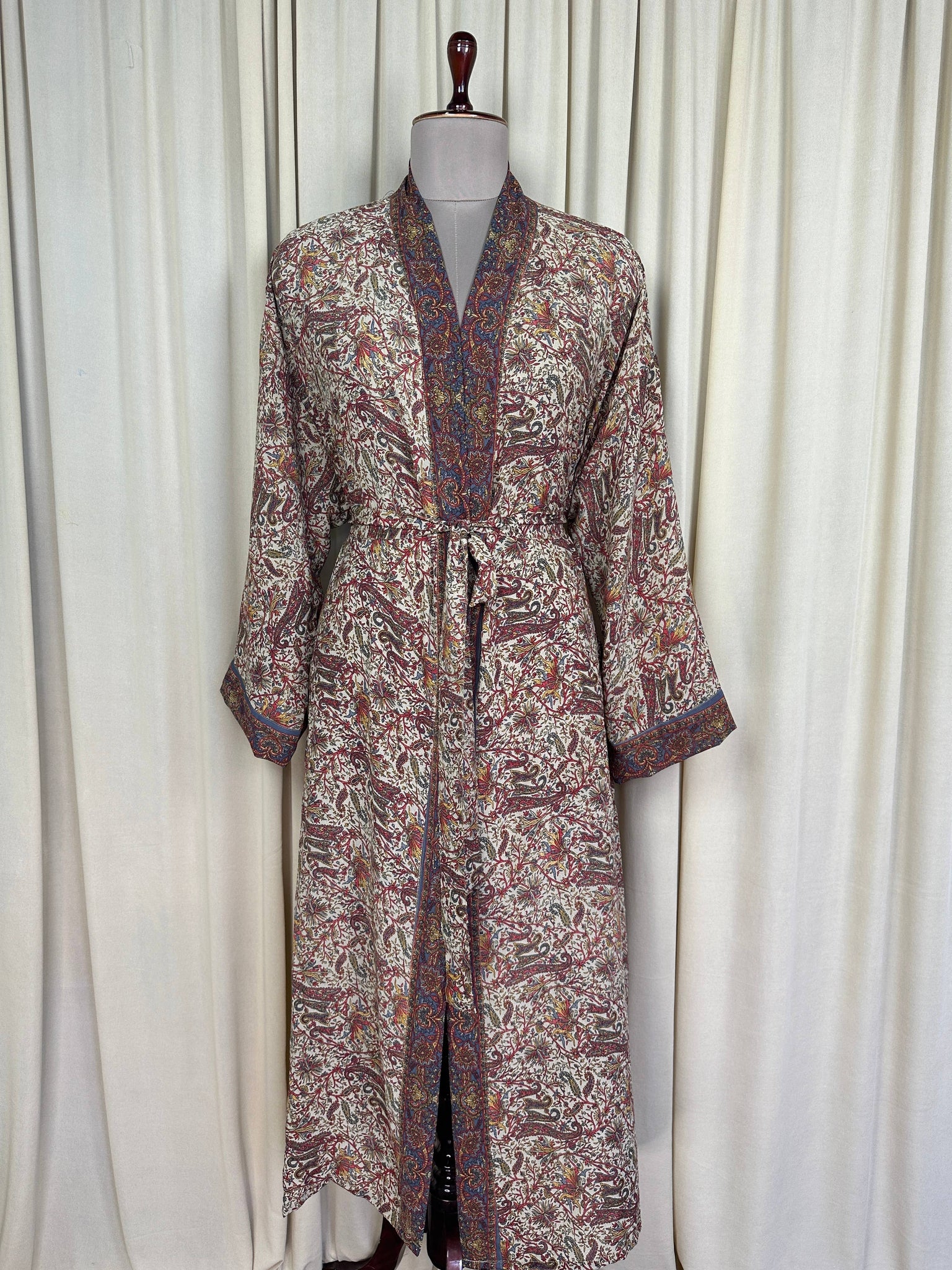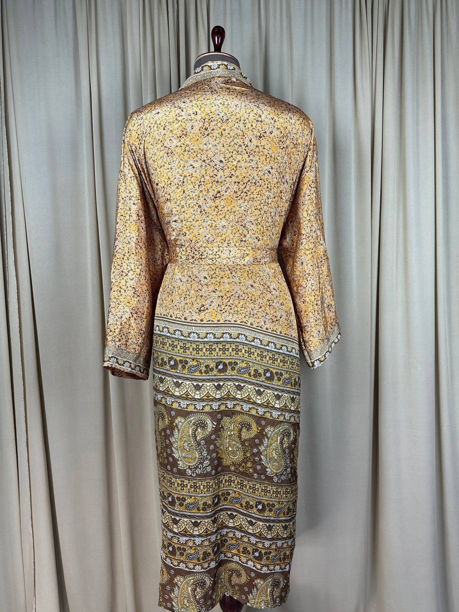 Handcrafted from premium new silk saris, this robe defies convention with its weightless elegance and urban edge. Nearly invisible against your skin, it moves with you—fluid, unapologetic, and undeniably luxurious. Perfect for those who refuse to compromise on comfort or style. Slip into something that feels as good as it looks and let every evening become an act of rebellion against the ordinary.