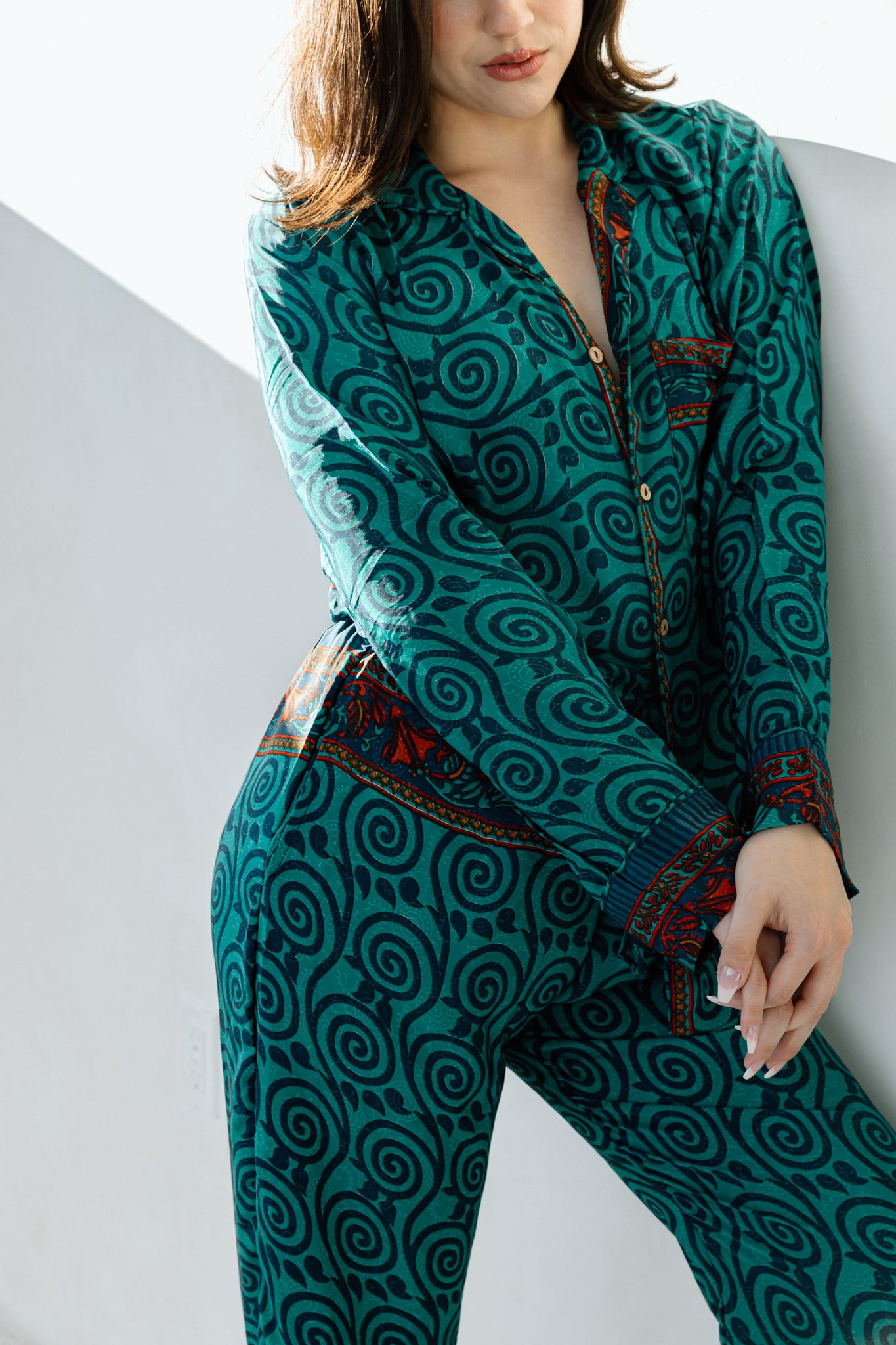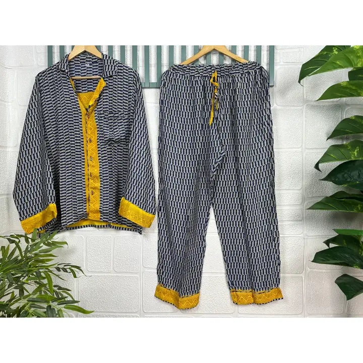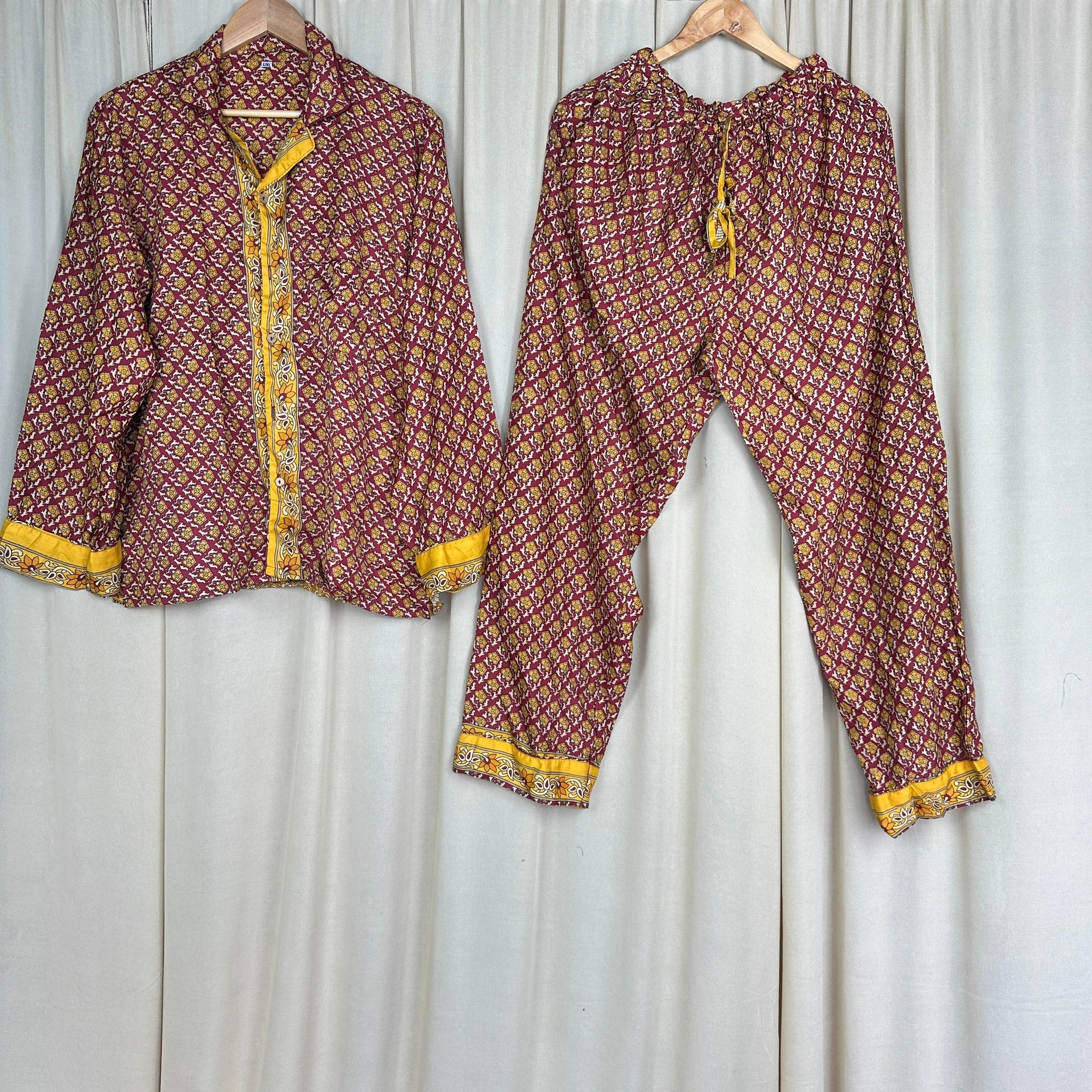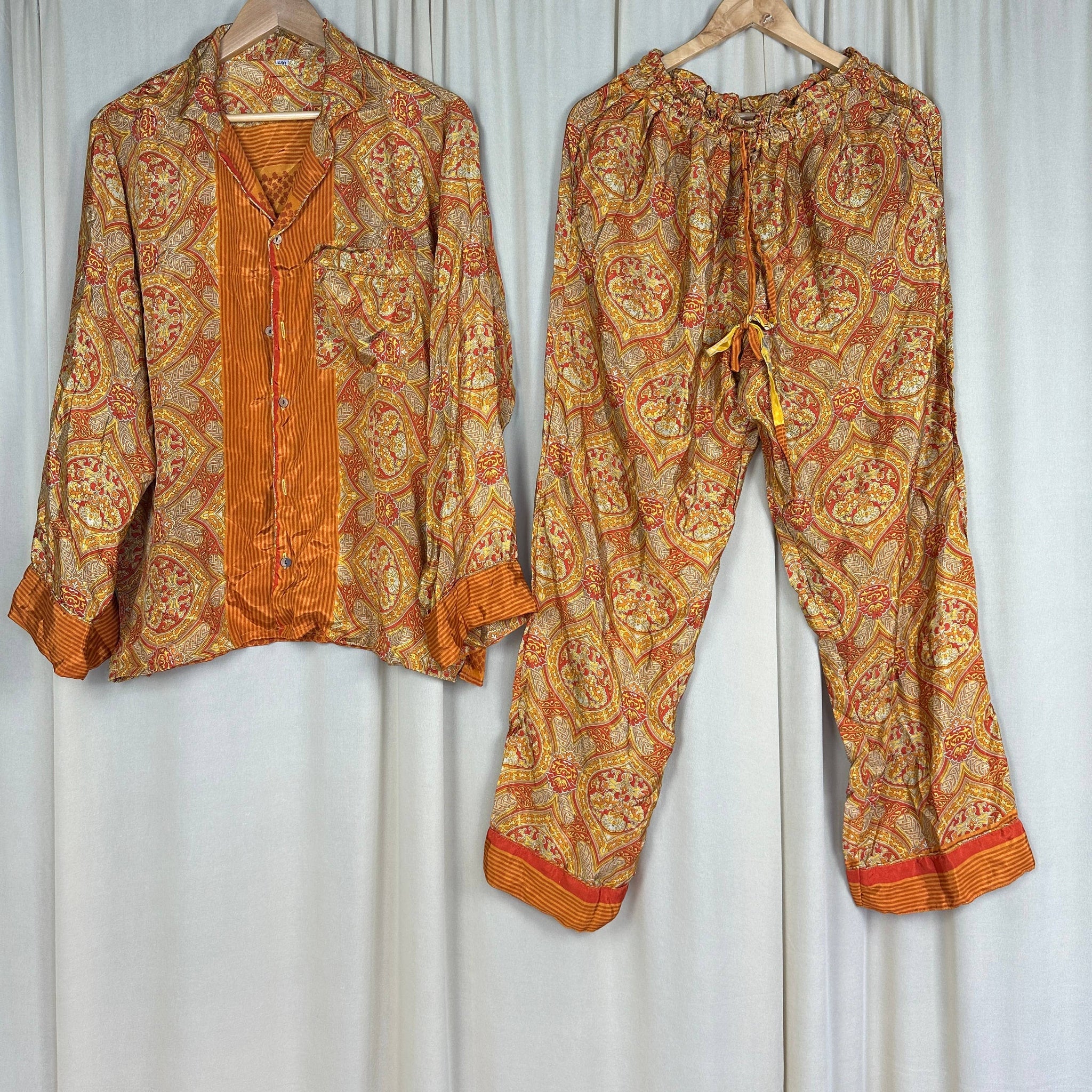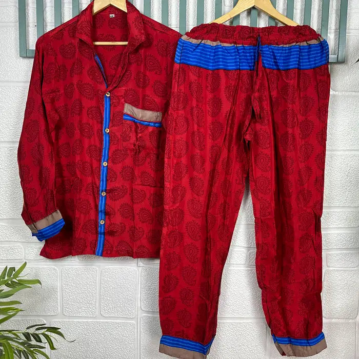 Unapologetically luxe and sustainably bold, these one-of-a-kind silk pajamas are crafted from recycled Indian saris—because breaking the mold means breaking free from fast fashion. Soft, weightless, and undeniably striking, they blur the line between bedroom essential and statement piece. Wear them lounging at home or turn heads out on the town. These aren't just pajamas; they're a rebellion against the ordinary, wrapped in silk that tells a story of transformation and defiance.